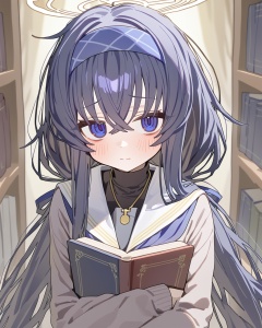 ningen mame,  1girl,  ui (blue archive),  solo,  book,  long hair,  black hair,  holding book,  holding,  hairband,  bangs,  bags under eyes,  blue hairband,  sailor collar,  blush,  long sleeves,  looking at viewer,  cardigan,  closed mouth,  white sailor collar,  hair between eyes,  school uniform,  halo,  upper body,  serafuku,  grey cardigan,  very long hair,  open book,  blue eyes,  purple eyes,  shirt,  crossed bangs,  ribbon,  black undershirt,  twintails,  bookshelf,  brown cardigan,  white serafuku