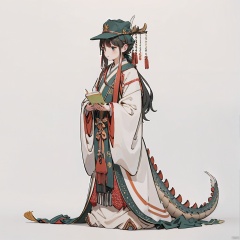 masterpiece, best quality, 1girl, Dragon King, solo, hat, white background, holding, full body, no humans, robe,
