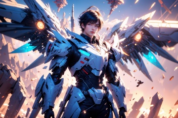 1boy,concept artwork,black hair,(a lonely solo boy:1.4),sky,wing,wings with fans,graphics card fan,strong male mecha warrior,mighty and domineering,cool mecha,32k,blue and white color scheme,white armor,white_background,standing,cowboy_shot,<lora:ASuo_v1:1>,