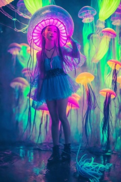 (masterpiece, top quality, best quality, official art, beautiful and aesthetic:1.2) ,cover art, masterwork photograph, pinhole lens, still, Black lighting, L USM, Holy [Casual|Sparkling] (Jellyfish:1.2) , 50mm, loop lighting, compact camera, split lighting, Nikon d3300, 80mm, Fujicolor Fujichrome Velvia 100, Fairy-Tale, DayGlo blue neon hue