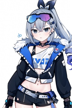 1girl,silverwolf, grey hair, long hair, grey eyes, eyewear on head, jacket, gloves, ponytail, black jacket, fingerless gloves, shorts, bronya zaychik, bangs, black gloves, fur trim, drill hair, sunglasses, shirt, hair ornament,masterpiece,best quality, silverwolf