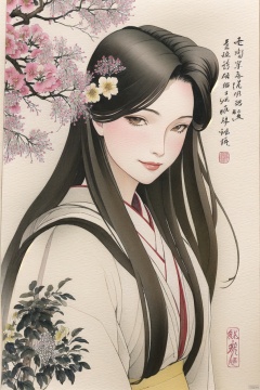 bgirl, 1girl, Exquisite facial features, looking-at-viewer, smile, hanfu,  flower,  traditional media,  painting \(medium\),  plant,  red flower,  watercolor \(medium\),  tree,  scenery,  branch,  seal,<lora:EMS-275616-EMS:1.000000>
