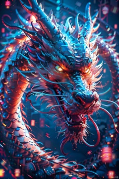 HDR, UHD, 8K, High detailed, best quality, masterpiece, (Cyber Theme:1.5) (Colorful/Neon Light:1.5) Chinese dragon - huge, (solo),(Side :1.5),(Wide Angle Camera: 1.33), (Thidallight: 1.33)
