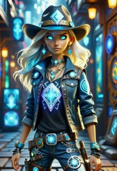hyper detailed masterpiece,DonMMy51ic4lXL, female cybernetic contraband trafficker,  young *****, hourglass, indigenous australian, black eyes, lobed ears,      square face shape, graceful clavicle,   , platinum blonde shag haircut hair, gratitude, hovering glide, character appears to hover slightly above the ground, legs crossed and arms relaxed,  wearing  cyber-metallic skinny pants,  cyber-denim vest,  plasma-mesh cowboy hat, solar-powered belt buckle , quantum blur, character stands in a dynamic, blurred pose, as if phasing in and out of reality due to quantum manipulation, post-cyberpunk , runes <lora:DonMMy51ic4lXL-v1.1-000006:0.8>