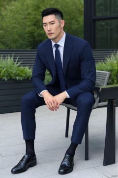 1man,solo,Asian,male focus,(masterpiece, realistic,Realism, best quality, highly detailed,profession),handsome,muscular,suit,sheer socks,footwear,soft lighting,sitting,dynamic pose,outdoors,blurry,full_shot,jzns, gx3