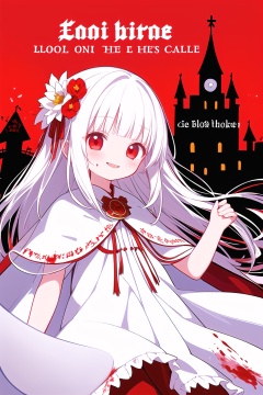 1girl,(loli:1.2),red eyes,white cape,(white hair),long hair,(red hair flower),(blood:1.2),(ghost castle:1.2),(english text),(silhouette),Long bangs,evil smile,cover,Text below,<lora:Puk 1.1:0.5>,
