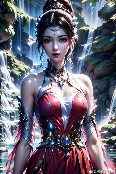 masterpiece,best quality,official art,extremely detailed CG unity 8k wallpaper,1girl,high ponytail, looking at viewer, pov, standing, angry, upper body, waterfall, pink dress,light rays, light particles,Transparent rabbit ears, 1girl