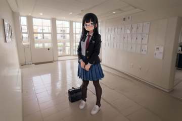 best quality, ultra-detailed, illustration,getabako, scenery, window, indoors, building, door, tree, daymultiple girls, glasses, black hair, long hair, standing, red necktie, pantyhose, white shirt, shoes, school uniform, blue skirt, collared shirt, <lora:getabako2_SD15_V1_DIM4:1>