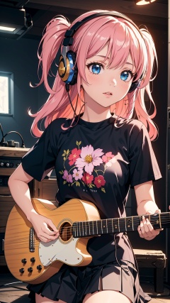 1girl, ((cinematic light)), colorful, hyper detail, dramatic light, intricate details, best quality, (extremely detailed CG unity 8k wallpaper, masterpiece, best quality, ultra-detailed, best shadow), (detailed background:1.4), (beautiful detailed face, beautiful detailed eyes), High contrast, (best illumination, an extremely delicate and beautiful),(girl:1.5), solo, black skirt, blue eyes, electric guitar, guitar, headphones, holding, holding plectrum, instrument, long hair, music, one side up, pink hair, playing guiter, pleated skirt, black shirt, indoors ((caustic)), dynamic angle,beautiful detailed glow,full body, cowboy shot,