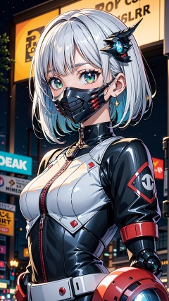 goth_punk,roblit,1girl,robot,solo,medium shot,walking in Harajuku,((night time:1.2)),bokeh,neon light,(colourful background:1.2),iridescent eyes,starry sky,white shimmer hair,white eyebrow,glowing hair,(iridescent white hair),earrings,bangs,jewellery,mask,blunt bangs,green eyes,mouth mask,blurry background,blurry,hair ornament,looking at the viewer,short hair,portrait,sidelocks,(with a robotic dragon pet wrapped around the body:1.2),<lora:Gothpunk:1>,<lora:add_detail:0.2>,<lora:robotbattle:0.8>,
