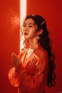 A young model in Chinese dress poses with her arms leisurely, in front of divine light with silhouette light illuminating the edges of the long curly hair, snowflake, solid color red background, Excellent skin texture, gaze deeply, cheerful atmosphere, in the style of eye-catching resin jewelry, Beauty product advertising, photo studio, matte photo, minimalist beauty, meticulous linework precision, feminine beauty,