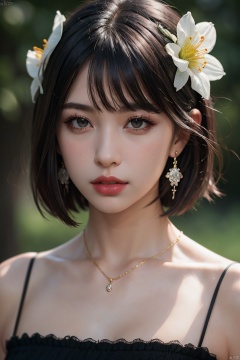1girl,  solo,  black hair,  short hair,  jewelry,  realistic,  earrings,  hair ornament,  black eyes,  lips,  collarbone,  flower,  watermark,  upper body,  portrait,  hair flower,  dress,  close_mouth,<lora:EMS-276654-EMS:0.800000>
