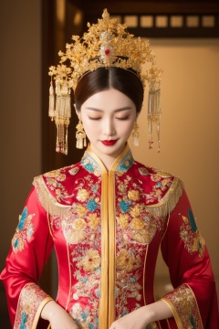 Chinese woman, traditional attire, Hanfu, red and blue robe, intricate embroidery, phoenix pattern, gold crown, beaded headdress, dangly accessories, closed eyes, serene expression, historical costume, studio portrait, warm lighting, rich color palette, cultural heritage, vertical composition, high-resolution image, finely detailed accessories, ornate jewelry, makeup with red lipstick, hands folded, regal posture, solemn atmosphere., masterpiece,best quality,ultra-detailed,