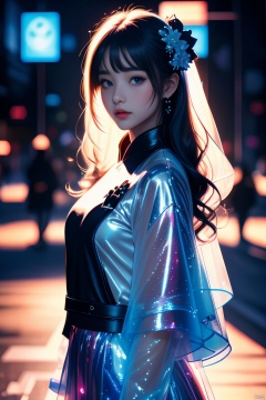 (masterpiece), best quality,((illustration)), (finely detailed face and beautiful eyes), (Detailed depiction), (Detailed depiction of the human body), (Fine CG), city,1girl,hanfu,white long hair, bangs, blue eyes,exquisite,pleated skirt,Ming Dynasty Hanfu,mamian skirt,long coat,long skirt,pink hair,updo,centered composition,