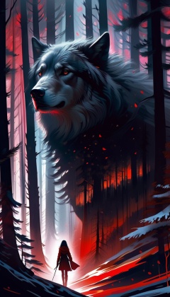 "black forest!!!! Double exposure movie poster dark fantasy manhwa neo-noir red movie little red riding hood warrior princess and the big bad wolf in black forest!!!! wolf!!! Masterpiece,  Intricate,  Insanely Detailed,  Art by Kim Jung Gi,  Gregory Crewdson,  Yoji Shinkawa,  Guy Denning,  Ink Drip,  Paint Splatter,  Textured!!!!,  Chiaroscuro!!", Decora_SWstyle,  actionpainting,<lora:EMS-261918-EMS:0.800000>,<lora:EMS-32082-EMS:0.700000>