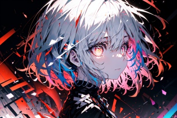 Light-electric style,  shining,  solo,  short hair,  multicolored eyes,  Colorful pupils, looking at viewer,  bangs,  from side,  white hair,  multicolored hair,  1other, Head, Big head photo, ,  rainbow hair,  closed mouth,  androgynous,  1girl,  glint,  glowing,  simple background,  shiny,  looking to the side, Gorgeous background, Heads, The picture is focused on the eyes, Big eyes, Close-up of eyes, Colorful,<lora:EMS-282257-EMS:0.700000>