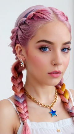 (best quality),(masterpiece),1girl, solo, braid, jewelry, pink hair, necklace, multicolored hair, white background, looking at viewer, eyelashes, simple background, parted lips, earrings, multiple braids, upper body, blue eyes, star (symbol), long hair, lips, collarbone, forehead, nose, makeup, mole, pink lips, dress, multicolored clothes, realistic, mascara