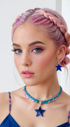 (best quality),(masterpiece),1girl, solo, braid, jewelry, pink hair, necklace, multicolored hair, white background, looking at viewer, eyelashes, simple background, parted lips, earrings, multiple braids, upper body, blue eyes, star (symbol), long hair, lips, collarbone, forehead, nose, makeup, mole, pink lips, dress, multicolored clothes, realistic, mascara