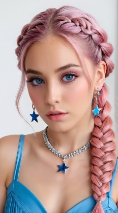 (best quality),(masterpiece),1girl, solo, braid, jewelry, pink hair, white background, looking at viewer, eyelashes, simple background, parted lips, earrings, multiple braids, upper body, blue dinond eyes, star (symbol), long hair, collarbone, forehead, nose, gorgeous makeup, mole, dress, multicolored clothes, realistic, mascara