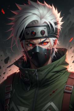 masterpiece, best quality,kakashi, 1boy, solo, male focus, mask, heterochromia, forehead protector, glowing, white hair, green eyes, red eyes, scar, mouth mask, scar on face, looking at viewer, glowing eye, debris, spiked hair, scar across eye, konohagakure symbol, short hair, blood, high collar