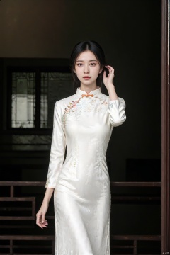 1girl,outdoor,looking_at_viewer,side_blunt_bangs,china_dress,chinese_style,big breasts,pose,solo,1girl,black hair,black eyes,  cheongsam