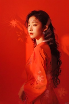 A young model in Chinese dress poses with her arms leisurely, in front of divine light with silhouette light illuminating the edges of the long curly hair, snowflake, solid color red background, Excellent skin texture, gaze deeply, cheerful atmosphere, in the style of eye-catching resin jewelry, Beauty product advertising, photo studio, matte photo, minimalist beauty, meticulous linework precision, feminine beauty,