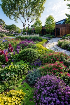 masterpiece,best quality, garden, path,tree,purple flowers,building