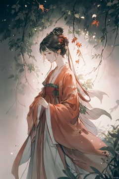 Fashion editorial style a asian girl with hanfu ruqun,Jin style, joint brand, ribbon, Withered leaves, old vines, plant illustration, splash ink,High fashion, trendy, stylish, editorial, magazine style, professional, highly detailed, cinematic lighting, Dramatic lighting, concept art,