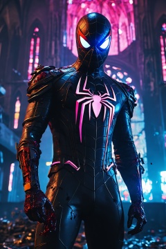 (Killer Spider-Man) from (Marvel), the entire suit drenched in blood, with (pieces of torn clothes) scattered about. The character features (intricate and angular cybernetic implants) inside a (brutalist building) combined with a (Gothic brutalist cathedral) backdrop, creating a (cyberpunk) atmosphere. The image is reminiscent of a (Foto premiada) with a focus on (Bokeh) and neon lights. This masterpiece is in (4K Cyber) resolution, blending the elements of a brutalist and cyberpunk aesthetic into a visually captivating and chilling scene.