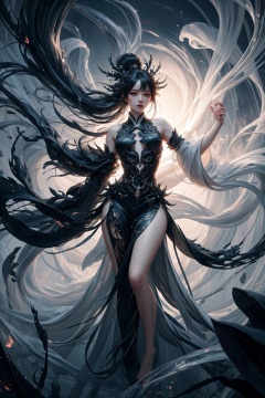 style of Karol Bak,the 1girl with white hanfu is standing in front of the black (chinese_dragon),bare legs,barefoot,dynamic pose,looking away,in the style of otherworldly beings,animecore,dark and menacing,intricate illustrations,delicate linework,fine details,whimsical patterns,enchanting scenes,dreamy visuals,captivating storytelling,gorecore,enigmatic characters,twisted characters,depth of field,floating,dynamic angle,long exposure,(motion blur):1.2,fluid movement,ethereal atmosphere,dreamy trails,dynamic energy,time-lapse effect,