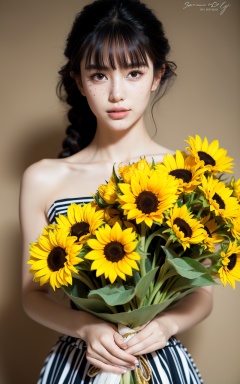 cover art,a woman holding a bouquet of sunflowers in her hand and looking at the camera with a smile,1girl,solo,flower,realistic,black hair,holding,looking at viewer,braid,parted lips,dress,bare shoulders,lips,upper body,long hair,sunflower,strap slip,black eyes,bouquet,striped,bangs,depth of field,freckles,white dress,striped dress,