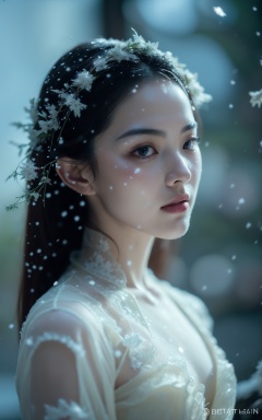 (masterpiece, top quality, best quality, official art, beautiful and aesthetic:1.2),(art by Anna Dittman:1.3),1girl,ballerina,(teenager:1.3),fair_skin,slender,diamond face,brown hair,light_blush,small nose,pointed nose,collarbonea,small_breasts,smile,reality,realistic,rubble_ruins,full_shot,in the forest,asians,darkness,the dark forest has only a little light shining through the leaves to the ground,(it's snowing:1.4),(very strong contrast:1.3),wearing handmade lace wedding dress,cool tone,film grain,