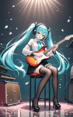 (masterpiece), (best quality), illustration, ultra detailed, hdr, Depth of field, (colorful), 1girl, instrument, solo, long hair, hatsune miku, skirt, thighhighs, twintails, shirt, very long hair, detached sleeves, sitting, neck ribbon, black skirt, headphones, white shirt, ribbon, high heels, playing instrument, sleeveless shirt, aqua ribbon, pleated skirt, miniskirt, guitar, black thighhighs, holding, music, full body, sleeveless, holding instrument, aqua hair, see-through, black footwear, petals, layered sleeves, see-through sleeves, zettai ryouiki, open mouth, bare shoulders, hair between eyes, stool, black sleeves, looking at viewer, long sleeves, aqua eyes, hair ornament, nail polish, collared shirt, white sleeves, electric guitar, see-through legwear, smile