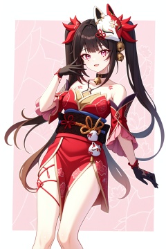 <lora:花火v2:1>, 1girl,huahuo,twintails,bare shoulders,fox mask,mask on head,red dress,detached sleeves,black gloves,jingle bell,choker,obi,kimono,tattoo,barefoot,, (masterpiece,best quality:1.2),absurdres, high quality,