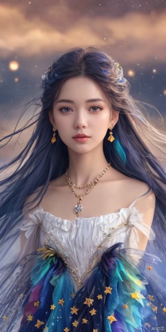 1girl, dance, Fairy, crystal, jewels,black, wings,All the Colours of the Rainbow, Crystal clear,solo, long hair, looking at viewer,black hair,jewelry, earrings,lips, makeup, portrait, eyeshadow, realistic, nose,{{best quality}}, {{masterpiece}}, {{ultra-detailed}}, {illustration}, {detailed light}, {an extremely delicate and beautiful}, a girl, {beautiful detailed eyes}, stars in the eyes, messy floating hair, colored inner hair, Starry sky adorns hair, depth of field,zj,