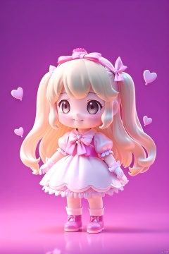 1girl, solo, long hair, looking at viewer, blush, smile, bangs, blonde hair, gloves, white background, dress, bow, holding, very long hair, closed mouth, short sleeves, hair bow, heart, one eye closed, puffy sleeves, white gloves, two side up, puffy short sleeves, hands up, black bow, pink bow, pink dress, ;\), balloon, holding balloon, heart balloon