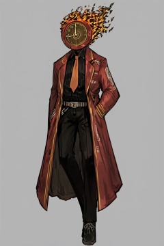 masterpiece, best quality, high resolution illustration, finely detailed, beautiful eyes and detailed face, hyper detail, intricate details, ((full body)), (standing), (solo), (1boy), *****, (black shirt, red necktie, belt, black pants, red coat, black shoes), (object head, clock head, broad shoulders, muscular body, fire), simple_background, grey_background, Library_of_Ruina, LimbusCompany_Dante