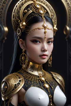 full body, breathtaking portrait of beautiful female looking at viewer, gold ornaments, in the style of gothic futurism, monochromatic symmetry, intricate embellishments, eerily realistic, yup'ik art, photo-realistic techniques, porcelain, subsurface scattering, Photorealistic, Hyperrealistic, analog style, realistic, film photography, soft lighting, heavy shadow . award-winning, professional, highly detailed, Eathereal goddess, non nsfw contents.