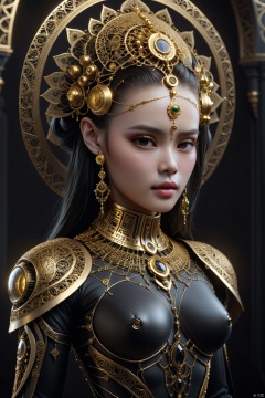 full body, breathtaking portrait of beautiful female looking at viewer, gold ornaments, in the style of gothic futurism, monochromatic symmetry, intricate embellishments, eerily realistic, yup'ik art, photo-realistic techniques, porcelain, subsurface scattering, Photorealistic, Hyperrealistic, analog style, realistic, film photography, soft lighting, heavy shadow . award-winning, professional, highly detailed, Eathereal goddess, non nsfw contents.