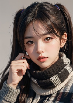 1girl, brown eyes, black hair, realistic, scarf, looking at viewer, twintails, solo, lips, long hair, portrait, nose, closed mouth, solo focus, finger to mouth, simple background,realistic details, surrealistic, sense of reality, intense contrast of light and shadow