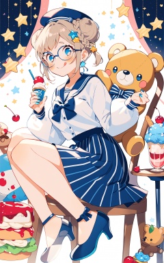 (masterpiece),(best quality) ,expressive-cartoons,1girl, tongue, tongue out, star \(symbol\), skirt, food, cup, glasses, blue eyes, star hair ornament, sitting, bow, hat, stuffed toy, hair ornament, stuffed animal, long sleeves, nail polish, solo, sailor collar, cherry, chair, blue nails, holding, hair bun, braid, blue skirt, blue footwear, :q, shirt, ice cream, high heels, striped skirt, double bun, bowtie, smile, blush, teddy bear, full body
