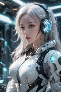 1girl,Future style gel coat,Future Combat Suit,Mecha,blurry background,breasts,depth of field,headphones,Glowing Clothing,Future Technology Space Station,Clothing with multiple light sources,Upper body,Oblique lateral body,Above the abdomen,headset,lips,long hair,looking at viewer,medium breasts,parted lips,realistic,science fiction,solo,upper body,White hair