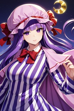 knowledge_touhou, patchouli_knowledge_touhou, 1girl, long_sleeves, striped_dress,capelet