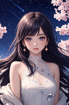 (masterpiece), (best quality), (ultra-detailed), (illustration), 1girl, mixed-blood, stars in the eyes, cherry blossoms, messy floating hair, crystal earrings, colored inner hair, Starry sky adorns hair, (colorful Bubble), (pearl), (Galaxy), depth of field, upper body, lace-trimmed dress