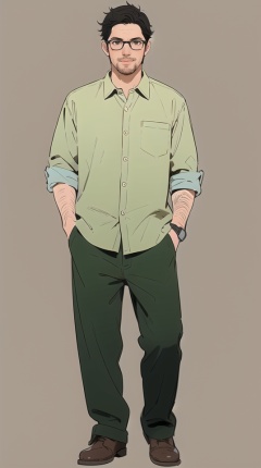 (best quality), ((masterpiece)), (highres), illustration, original, extremely detailed,jjj, 1boy, male focus, solo, shirt, pants, glasses, full body, smile, facial hair, white background, watch, collared shirt, simple background, wristwatch, shoes, brown footwear, yellow shirt, hands in pockets, black hair, short hair, green pants, standing, green shirt, sleeves rolled up, brown shirt, stubble, brown eyes, pocket, black-framed eyewear