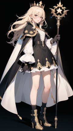 (best quality), ((masterpiece)), (highres), illustration, original, extremely detailed,ooo, 1girl, solo, long hair, holding, holding staff, staff, socks, full body, looking at viewer, dress, gloves, black dress, black gloves, boots, star \(symbol\), white socks, black background, closed mouth, long sleeves, cape, standing, bangs, kneehighs, hair between eyes, blonde hair, crown, very long hair, high heels, puffy sleeves, white cape, simple background, white hair, brown eyes, sparkle