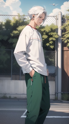 (best quality), ((masterpiece)), (highres), illustration, original, extremely detailed, 1boy, male focus, solo, outdoors, sky, green eyes, hand in pocket, shirt, earphones, cloud, artist name, bird, day, belt, pants, white hair, fence, earbuds, white shirt, long sleeves, looking to the side