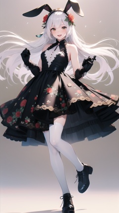 (best quality), ((masterpiece)), (highres), illustration, original, extremely detailed,1girl, solo, gloves, thighhighs, rabbit ears, long hair, animal ears, dress, black gloves, flower, black footwear, sleeveless, white background, open mouth, blue flower, sleeveless dress, full body, white hair, holding, simple background, bare shoulders, very long hair, rose, hair ornament, black thighhighs, white dress, smile, official alternate costume, hair flower, yellow eyes, looking at viewer, blue rose, black dress, bangs, breasts, bow, shoes, hairband, brown thighhighs, blush, pocket watch, :d, small breasts, brown eyes, card, hands up, standing, standing on one leg, floating hair, zettai ryouiki, short dress, no background