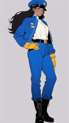 (best quality), ((masterpiece)), (highres), illustration, original, extremely detailed,ooo, 1girl, solo, black hair, dark-skinned female, boots, white background, black gloves, gloves, long hair, dark skin, hat, pants, flat color, blue headwear, full body, simple background, jacket, black footwear, single glove, hand on hip, long sleeves, shirt, brown eyes, blue pants, belt, beret