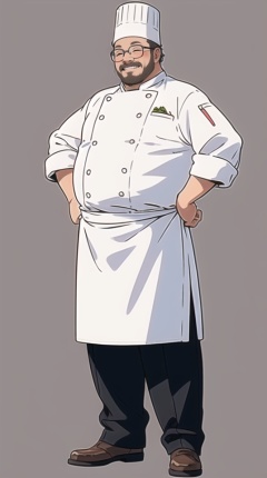 (best quality), ((masterpiece)), (highres), illustration, original, extremely detailed,jjj, chef, 1boy, male focus, solo, chef hat, hat, glasses, closed eyes, simple background, smile, full body, white background, facial hair, pants, standing, shoes, black pants, hands on hips, brown footwear, facing viewer, apron, fat